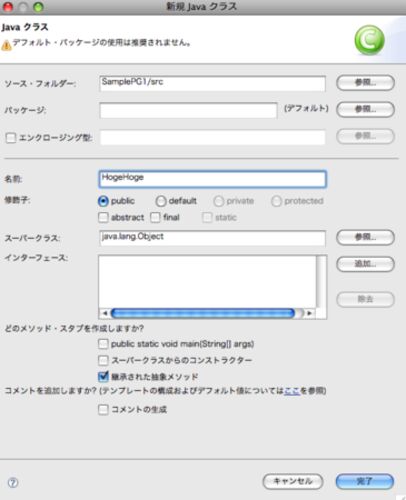 職場ではEclipseを使っていて,自宅ではNetBeansをRails開発でしか使っていないので,全然気がつかなかったのですが,NetBeansのJava環境で戸惑った点。例えば,新規クラスの作成。下はEclipseの例。 で、NetBeansでは スーパークラスとか,インターフェース…